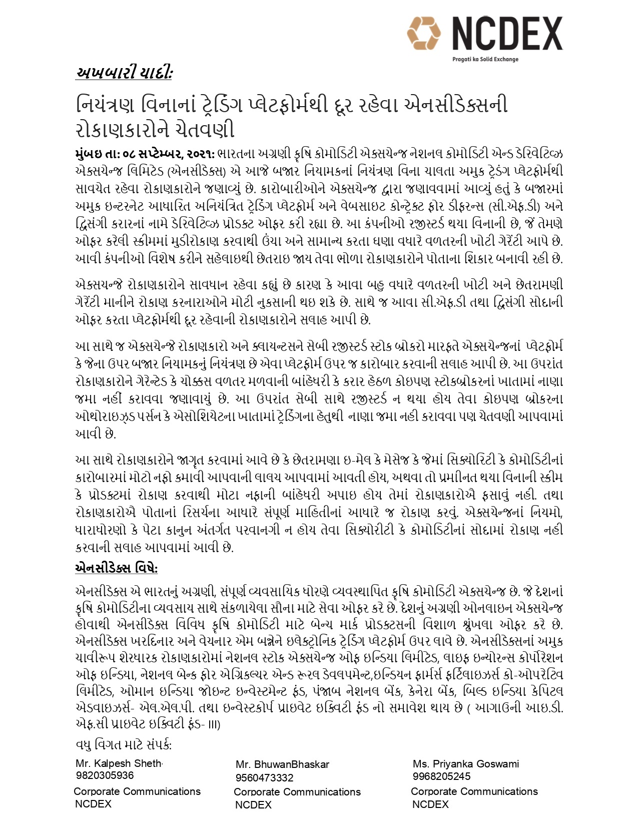Press Release - NCDEX Cautions market participants about unregulated trading platforms_Gujarati